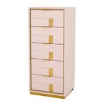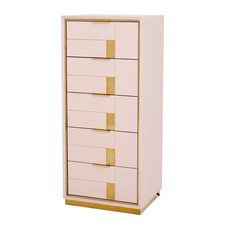 Organize in style with our Margo Upholstered 5-Drawer Tallboy, where luxury meets functionality. Crafted with meticulous attention to detail, this exquisite tallboy features gold accents that add a touch of opulence to your space. Made from premium fabric, our drawer unit effortlessly blends elegance and durability. Elevate your storage experience with this piece instantly.