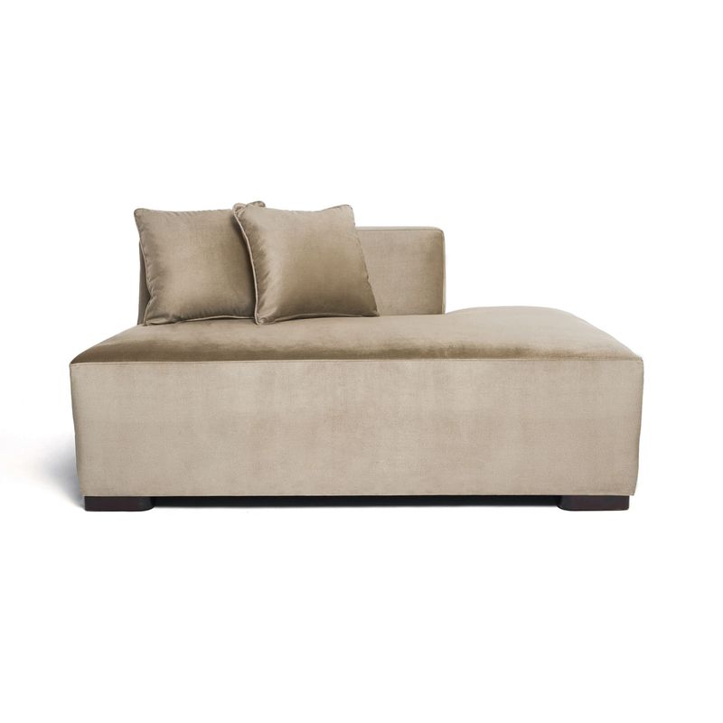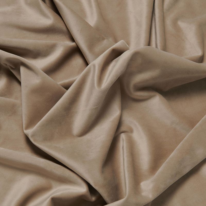 • قماش مخملي بلون كاكي معتّق يعزّز من اللمسة الناعمة ويضفي طابعاً كلاسيكياً لا يخبو تألقه مع الزمن