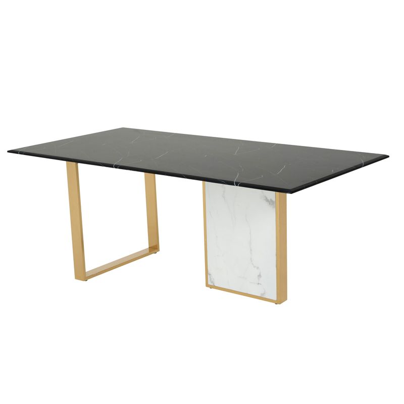 Featuring a natural marble top with a matching marble and metal base, this Slater dining table showcases a contemporary vibe. It has a rectangular-shaped top and is made using high-end material. It is an ideal option for extravagant dining spaces.