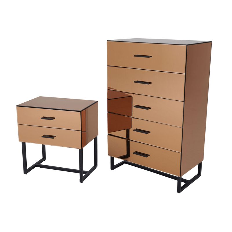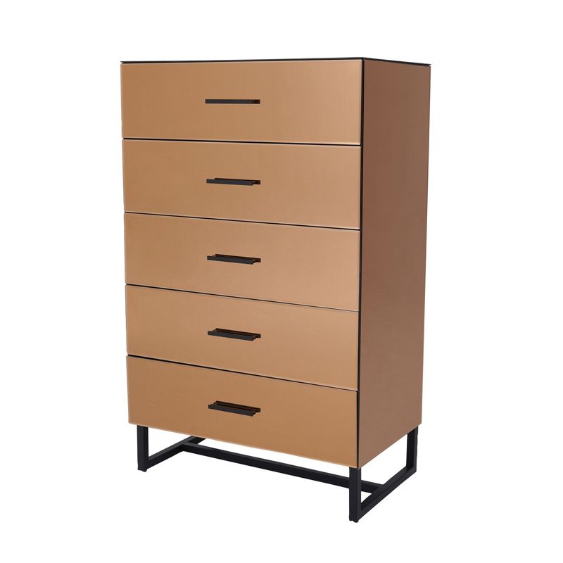 Glam up your bedroom with this Trinity mirrored tall boy. The design features a reflective gold mirror panelling throughout, contrasting black metal legs, and black drawer handles. In addition to the storage it provides, it also adds luxe polish to the surroundings.